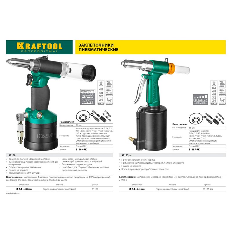 Пневматический заклепочник KRAFTOOL 31185_z01, предназначен для создания неразъемных соединений из различных материалов и профилей с высокой скоростью, надежностью и качеством. Инструмент непревзойденного качества, который предназначен для профессионалов.