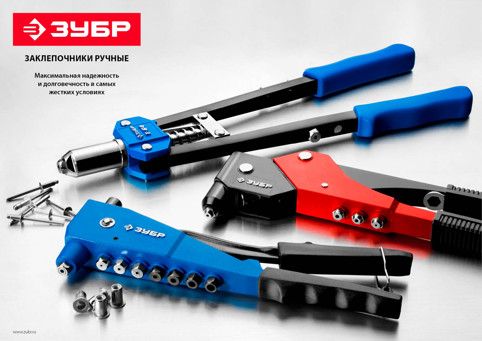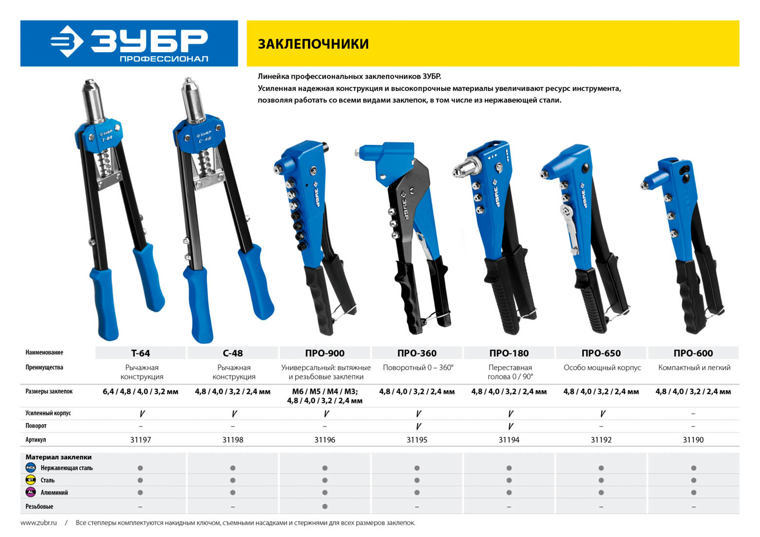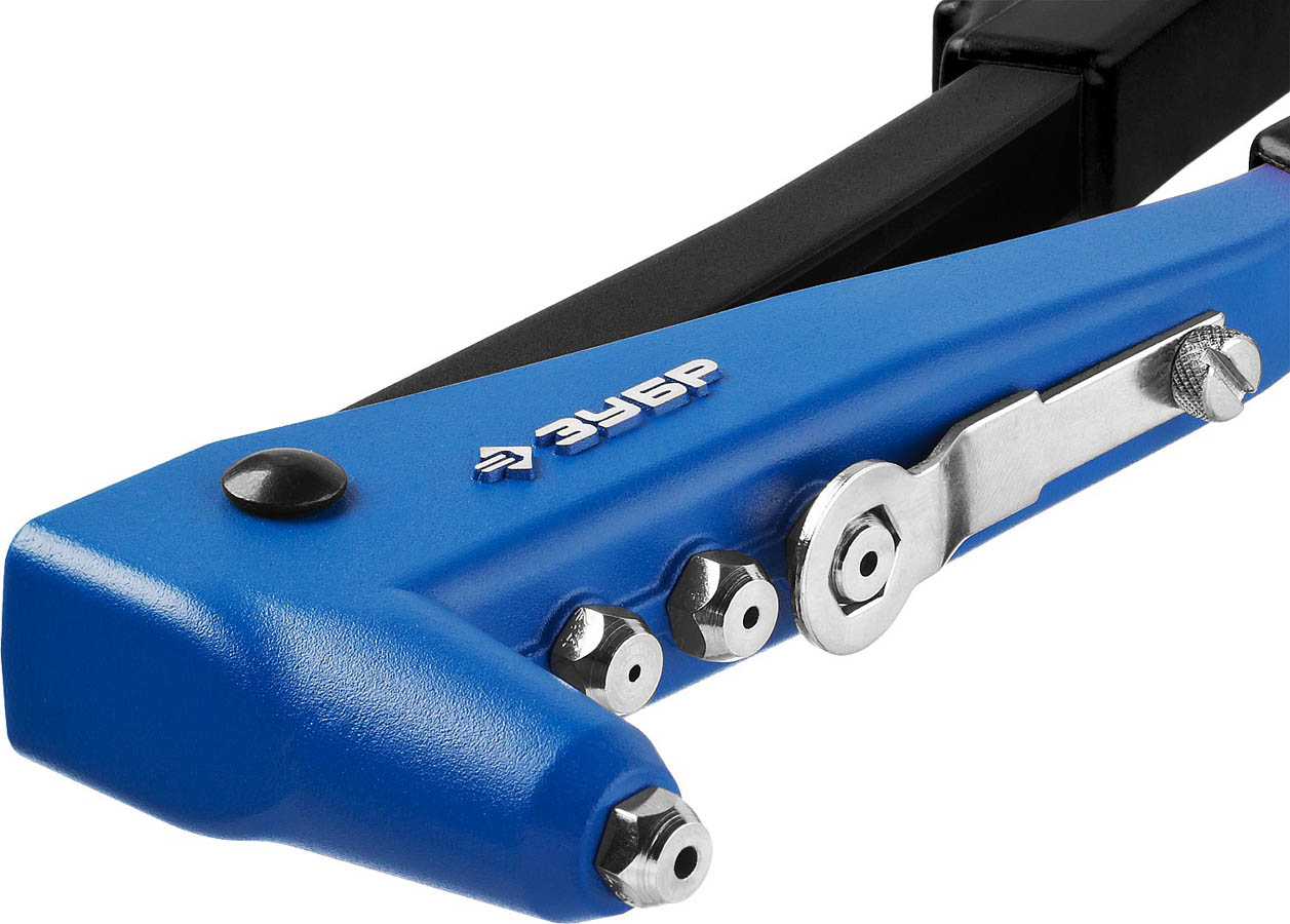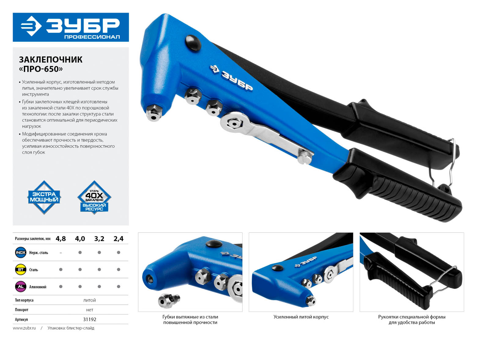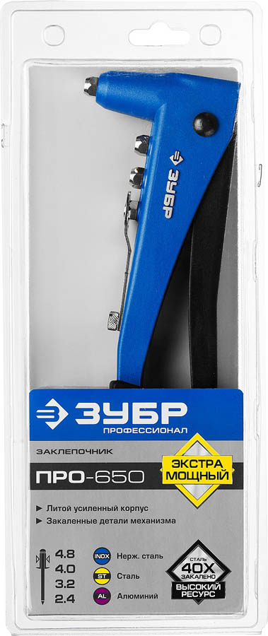 Заклепочник усиленный, ЗУБР "ПРО-650" 31192, d=2,4 / 3,2 / 4,0 / 4,8 мм - алюминий и сталь, d=2,4 / 3,2 / 4,0 - нерж сталь, литой корпус, Профессионал