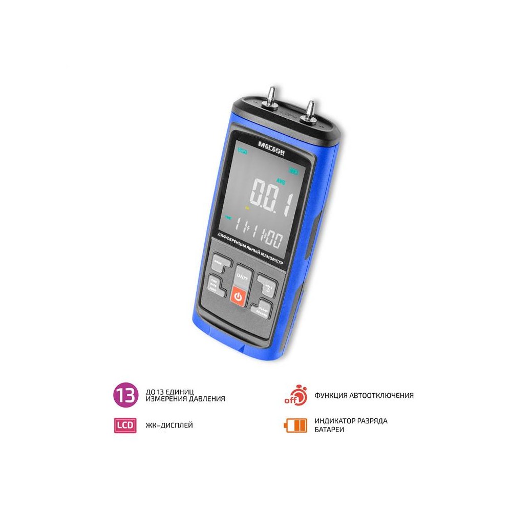 Прибор серии МЕГЕОН 5100Х - это цифровой дифференциальный манометр, предназначенный для измерения избыточного, пониженного и дифференциального давлений. Фиксация максимального, минимального и среднего значений и функция удержания данных значительно облегчат выполнение измерений. Возможность подключения к компьютеру позволяет выгрузить данные на ПК и проводить измерения с регистрацией в режиме реального времени. Прибор позволяет измерять давление в разных единицах. Изделия МЕГЕОН выгодно отличаются от существующих аналогов широкими функциональными возможностями и могут применяться для измерения расхода газов, контроль загрязненности фильтров и измерения избыточного давления в чистых помещения. Приведенный перечень далеко неполный. Функциональность по достоинству оценят как начинающие пользователи, так и профессионалы.