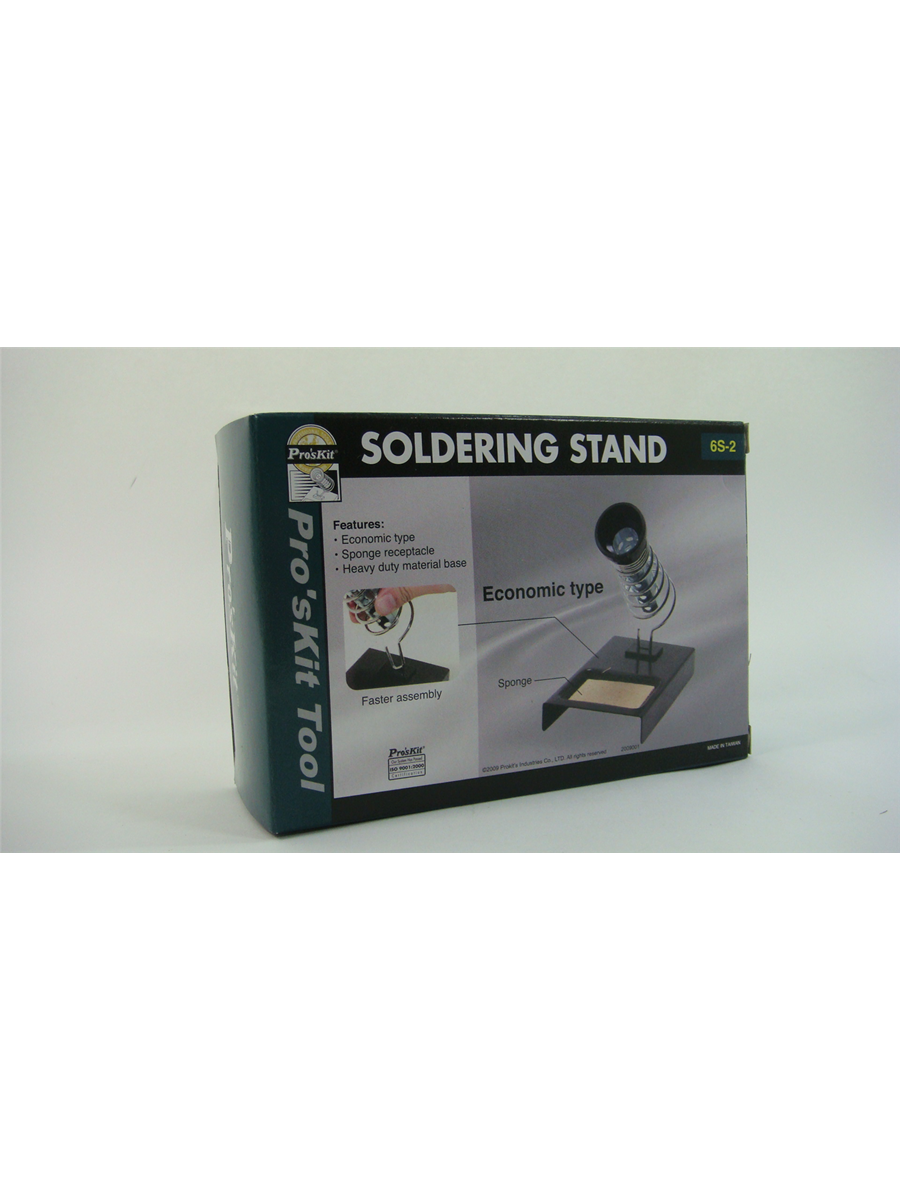 Подставка ProsKit 6S-2 предназначена для паяльников. Приспособление позволяет ставить паяльник при прогреве и пайке. Подставка имеет нескользящее основание из термостойкого пластика. Основа – металлическая.