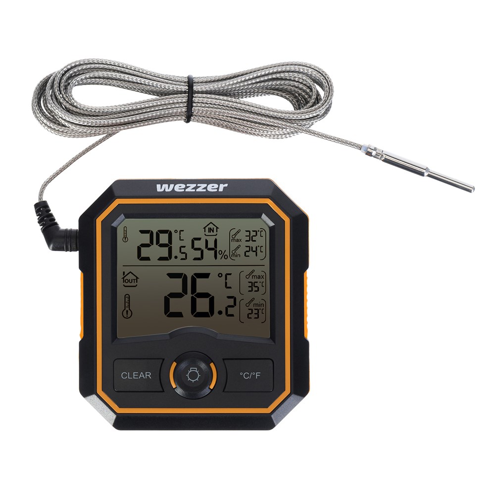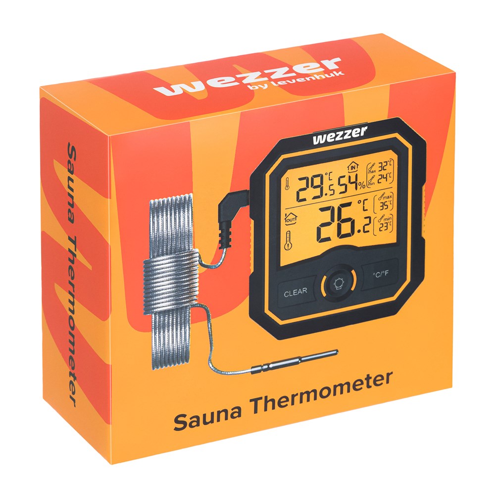 Levenhuk Wezzer SN20 – это электронный термометр для сауны. Состоит из основного блока с экраном и выносного термощупа на гибком кабеле. Предназначен для измерения температуры в парной и прилежащем помещении и позволяет поддерживать там максимально благоприятный микроклимат. Надежен, точен в измерениях, имеет долговечную конструкцию. В качестве источника питания используются стандартные батарейки. Чтобы не повредить электронные компоненты прибора, внутри парной устанавливают только термощуп, а основной модуль выносят в соседнее помещение. Модуль можно или поставить на полку (сзади есть откидная подставка) или прикрепить к металлической поверхности при помощи магнита на задней стенке. Термощуп обычно закрепляют на некотором расстоянии от пола рядом со стеной. На экране прибора можно видеть текущие измерения температуры с основного модуля и термощупа, а также ее минимальные и максимальные значения. Также основной модуль измеряет влажность воздуха. У экрана есть подсветка, ее можно включить нажатием на кнопку на внешней панели.