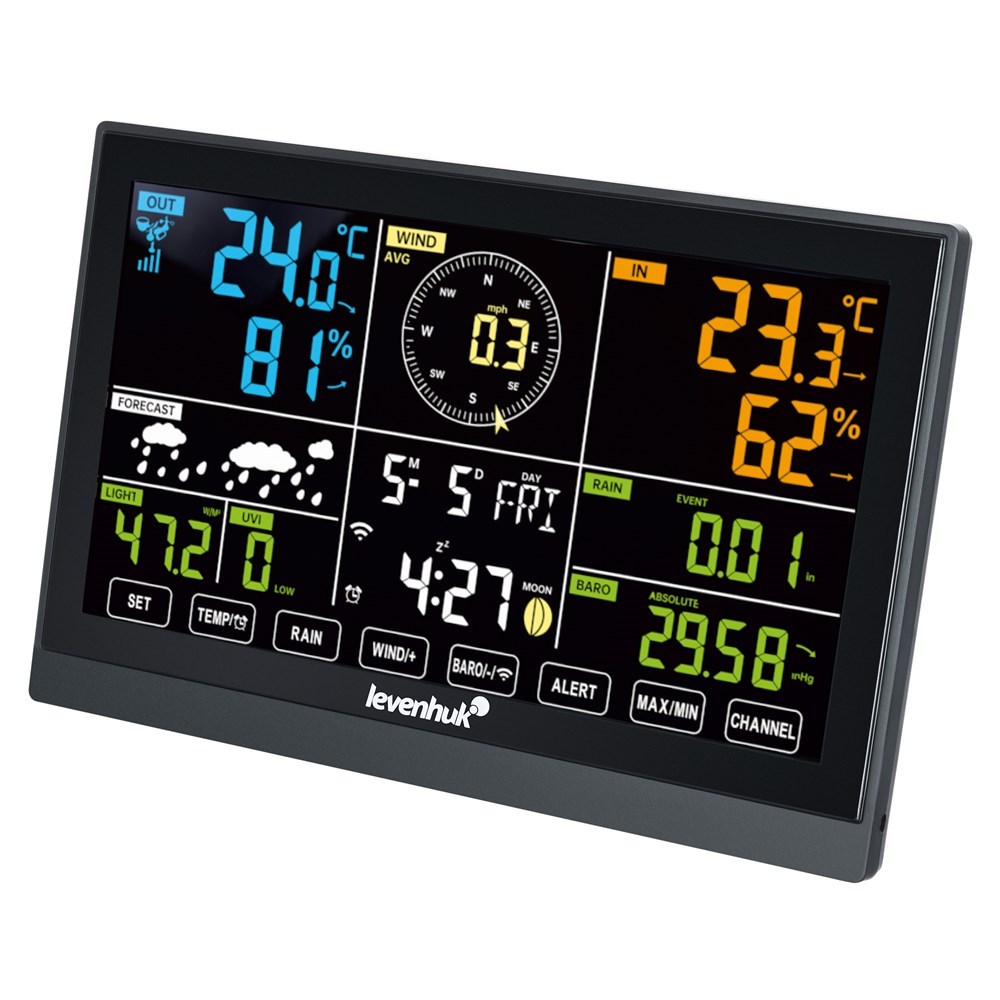 Levenhuk Wezzer PLUS LP150 – это метеорологическая станция с цветным дисплеем и внешним датчиком для определения температуры, давления, влажности воздуха, скорости и направления ветра (в том числе ветровых порывов), количества осадков и их интенсивности. В этой модели также есть функции измерений освещенности и уровня ультрафиолета. Для многих параметров предусмотрен вывод минимальных и максимальных значений в разных единицах измерения. В станции есть часы, будильник с функцией повтора и календарь. Станция подключается к интернету по Wi-Fi и синхронизируется с сервером точного времени (Time Server) и с погодными серверами (Weather Underground, Weather Cloud). Пользователь может получать актуальные метеосводки и предупреждения об ухудшении погоды. Метеостанция определяет точку росы, тепловой индекс, коэффициент охлаждения ветром. Эти параметры важны для нормального самочувствия, особенно для людей с хроническими заболеваниями, поэтому, если значения становятся выше комфортных, на дисплее высвечивается предупреждение. Если температура приближается к точке замерзания (ниже 1°C) появляется предупреждение об обледенении. Таким образом, можно планировать свои действия с учетом всех параметров, не выходя из дома. Есть возможность записывать в память устройства историю показаний за час, день, неделю, месяц, и делать прогнозы на длительное время. Внешний датчик станции можно установить на улице, например на балконе. Основной модуль следует устанавливать в помещении, при этом его можно поставить на стол или повесить на стену. Для работы со станцией при плохом освещении или ночью предусмотрена светодиодная подсветка экрана. Для питания датчика надо дополнительно заказать 3 пальчиковые батарейки (AA). В ясную погоду датчик может работать от встроенной солнечной панели. Для питания основного модуля требуются 3 батарейки (AAA) или подключение к сети.