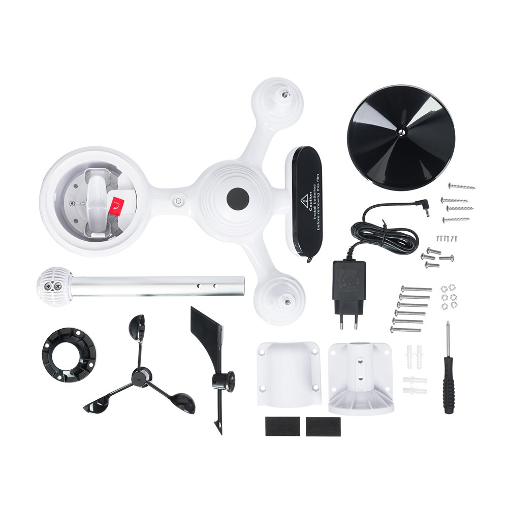 • Метеостанция • Беспроводной внешний датчик «7 в 1» • Воронка • Флюгер с 1 винтом • Чашки анемометра с 1 винтом • Монтажная стойка с 6 винтами • Резиновые прокладки – 2 шт. • Сетевой адаптер • Инструкция по эксплуатации и гарантийный талонТехнические характеристики