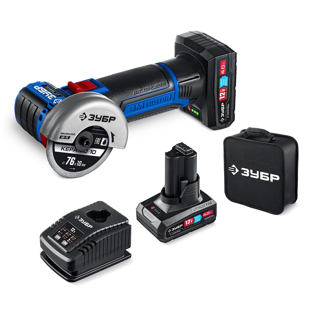 ЗУБР 12 В, D76 мм, 2 АКБ тип Т7 (4 А·ч), бесщеточная УШМ, сумка, Профессионал (AB-76-42)