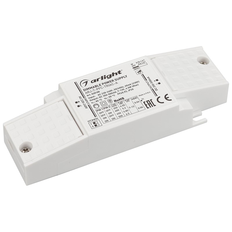 Диммируемый источник тока по стандарту TRIAC с гальванической развязкой для светильников и мощных светодиодов. Входное напряжение 220-240 VAC. Выходные параметры: 7-13 В, 350-500 mА, 6.5 Вт. Выбор значения тока осуществляется DIP-переключателем. Встроенный PFC >0,92. Негерметичный пластиковый корпус IP 20. Габаритные размеры длина 122 мм, ширина 41 мм, высота 23 мм. Гарантийный срок 5 лет.