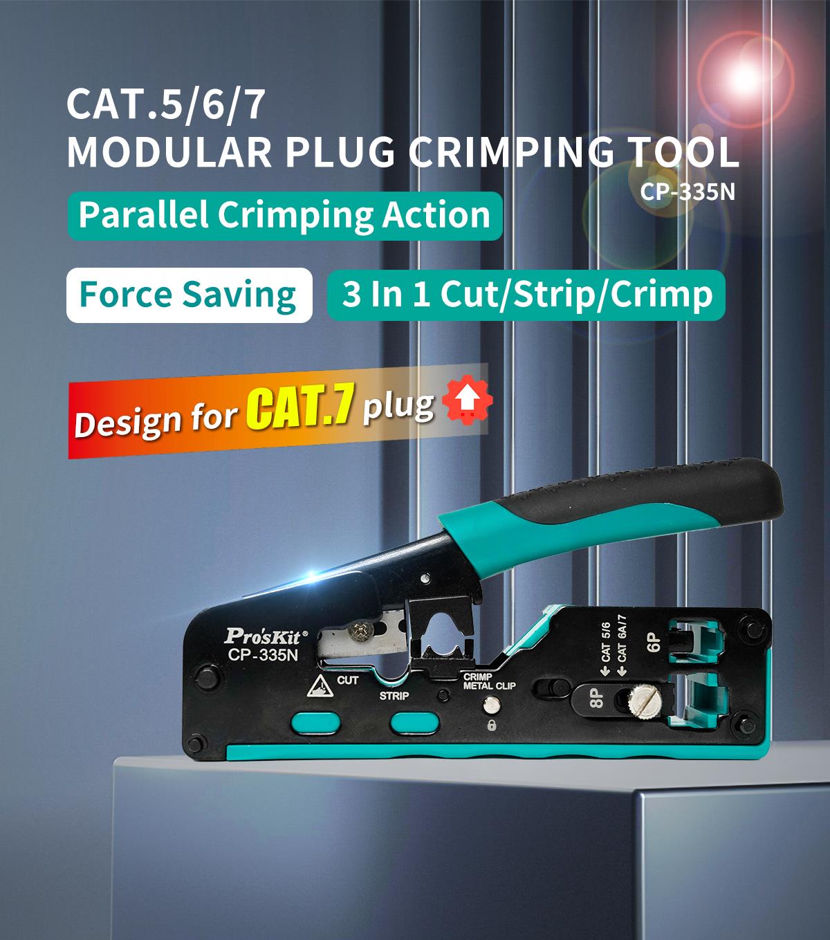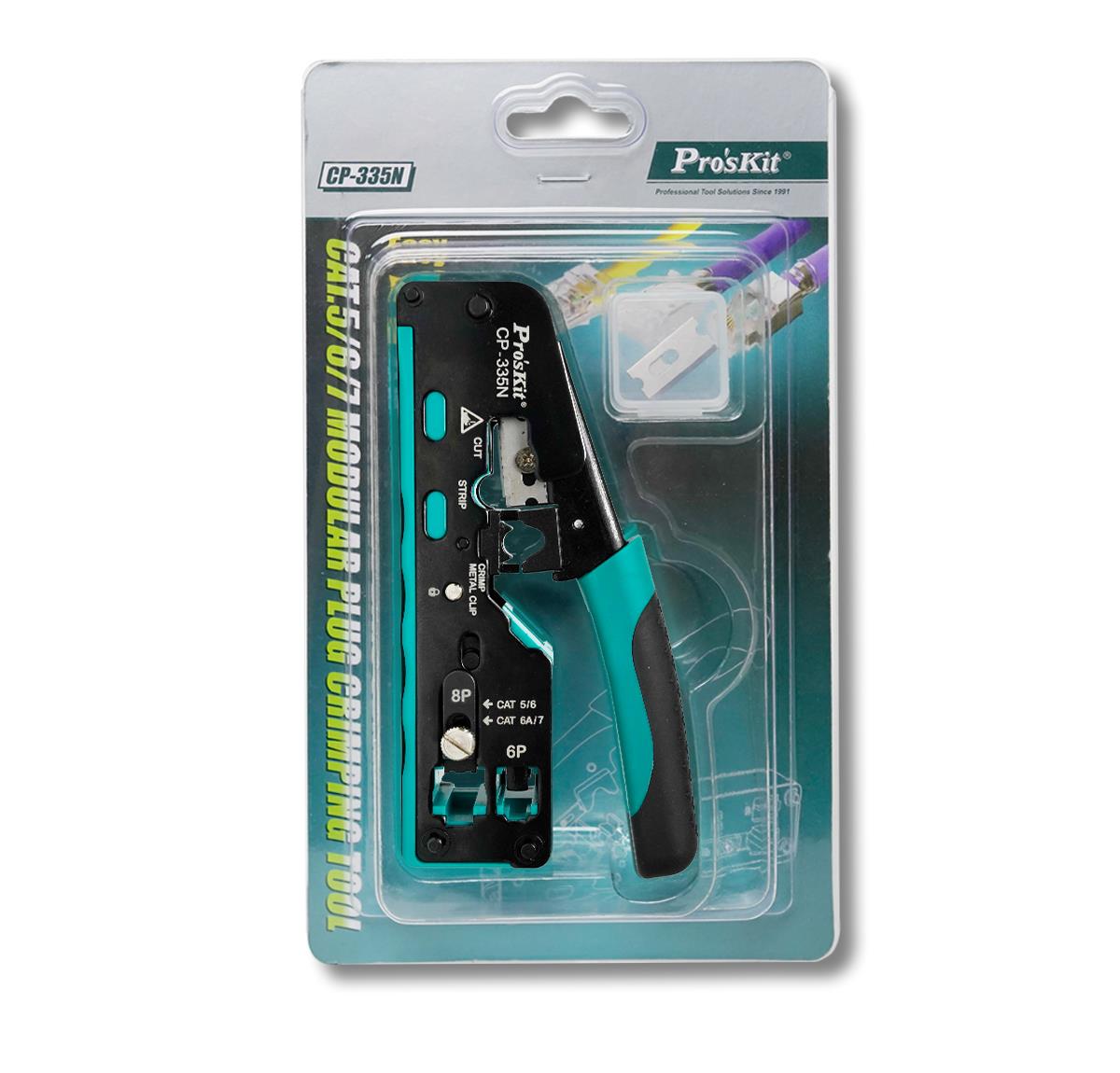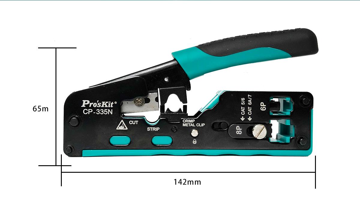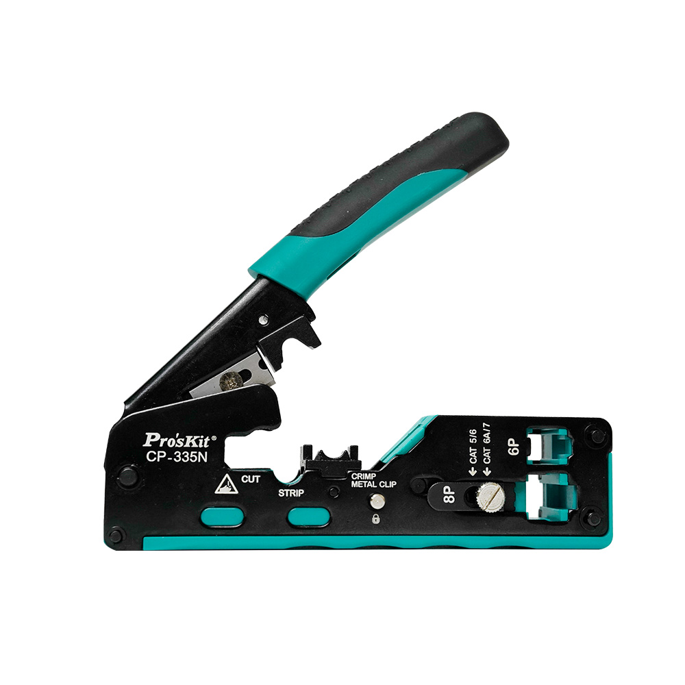 Pro’sKit CP-335N – это компактный модульный кримпер 3-в-1 для точной резки, зачистки и обжима сетевых коннекторов CAT 5/6/7. Инструмент имеет надежную прочную конструкцию механизма с параллельным ходом обжимных губок, что позволяет сэкономить время и усилия, необходимые для обжима коннекторов. Конструкция оснащена регулировочным винтом для легкой и быстрой замены коннекторов CAT 5/6 и CAT 7.