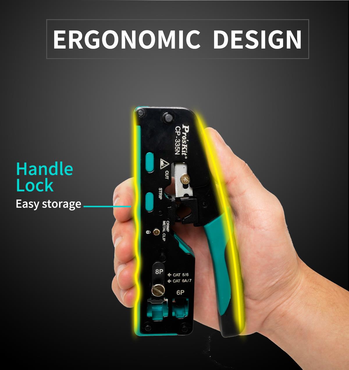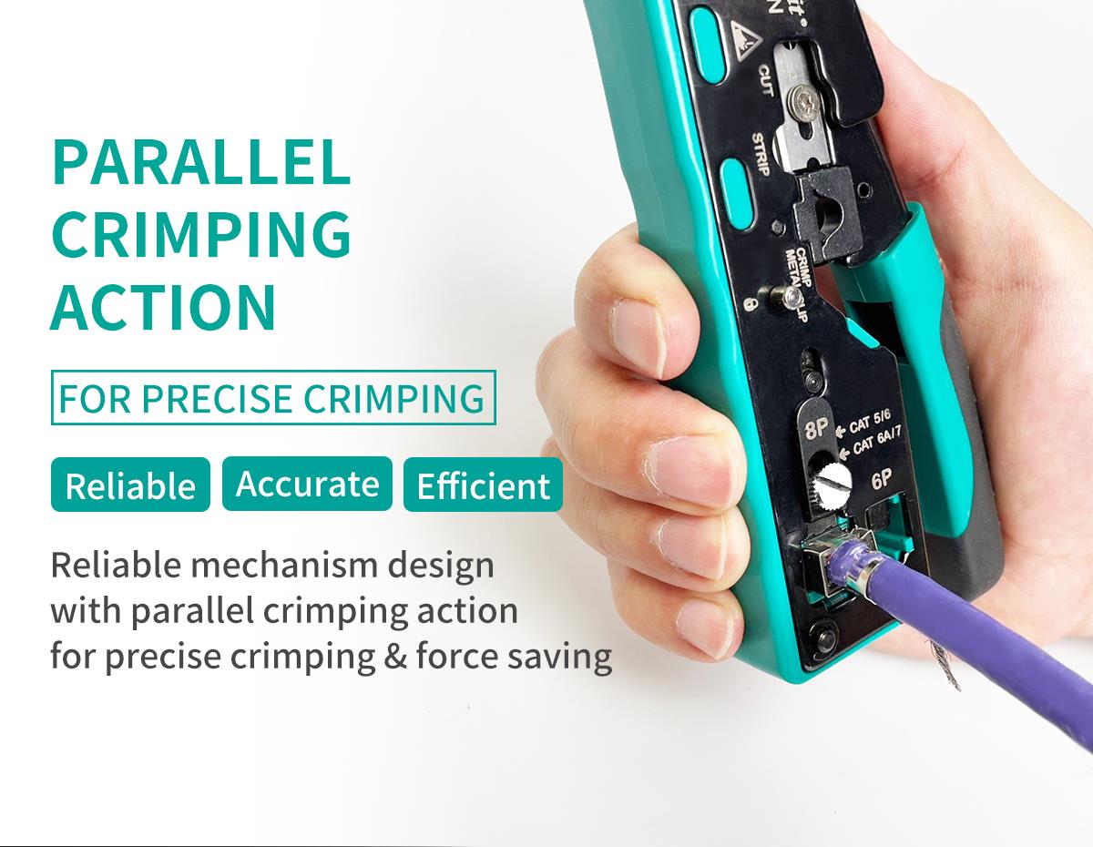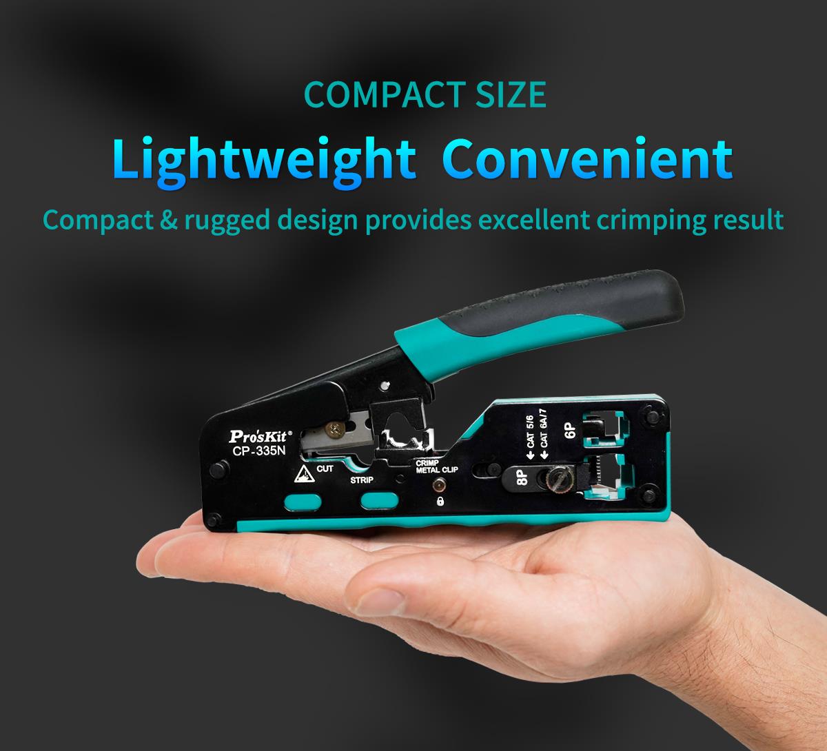 Pro’sKit CP-335N – это компактный модульный кримпер 3-в-1 для точной резки, зачистки и обжима сетевых коннекторов CAT 5/6/7. Инструмент имеет надежную прочную конструкцию механизма с параллельным ходом обжимных губок, что позволяет сэкономить время и усилия, необходимые для обжима коннекторов. Конструкция оснащена регулировочным винтом для легкой и быстрой замены коннекторов CAT 5/6 и CAT 7.