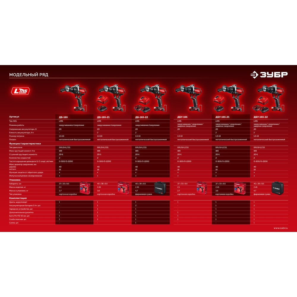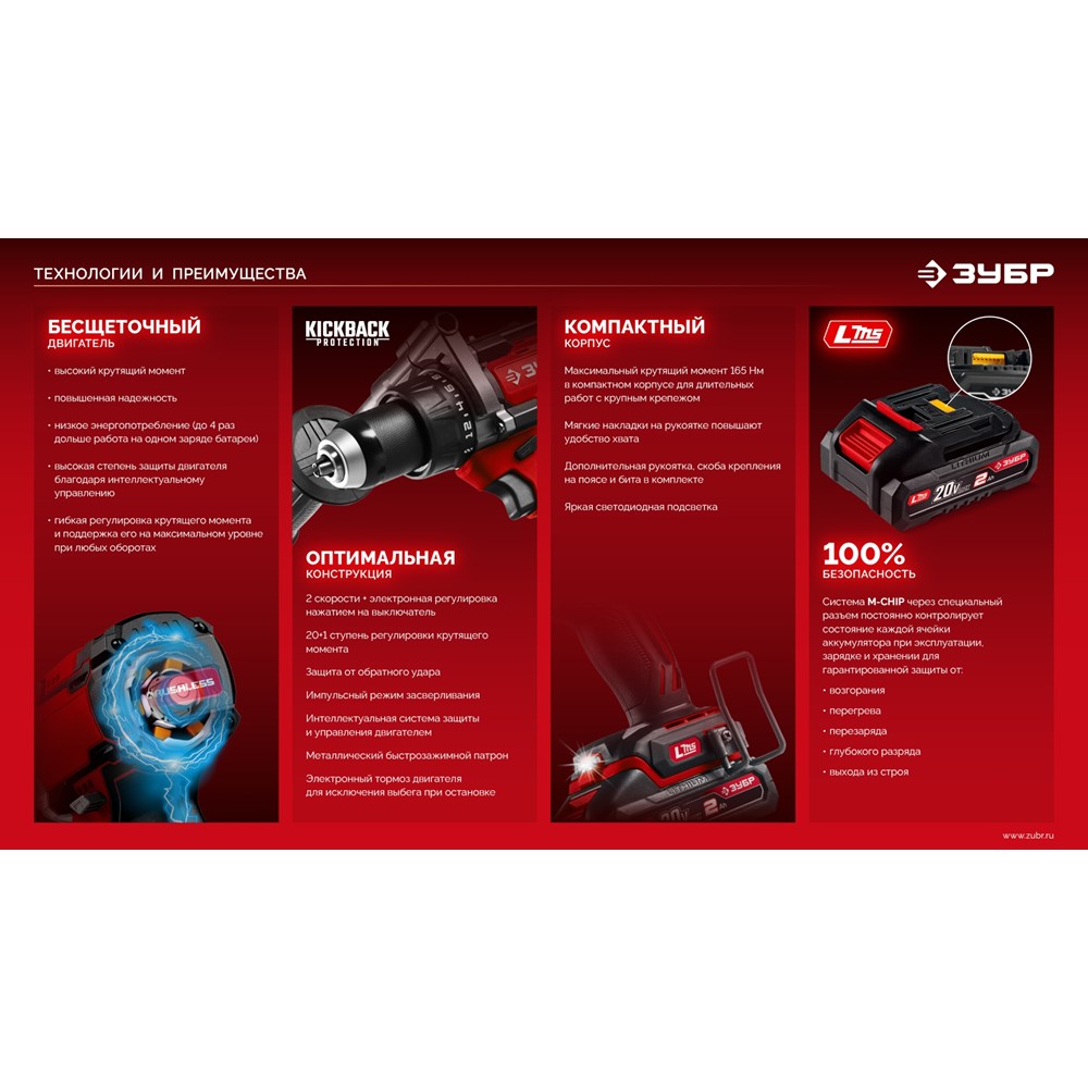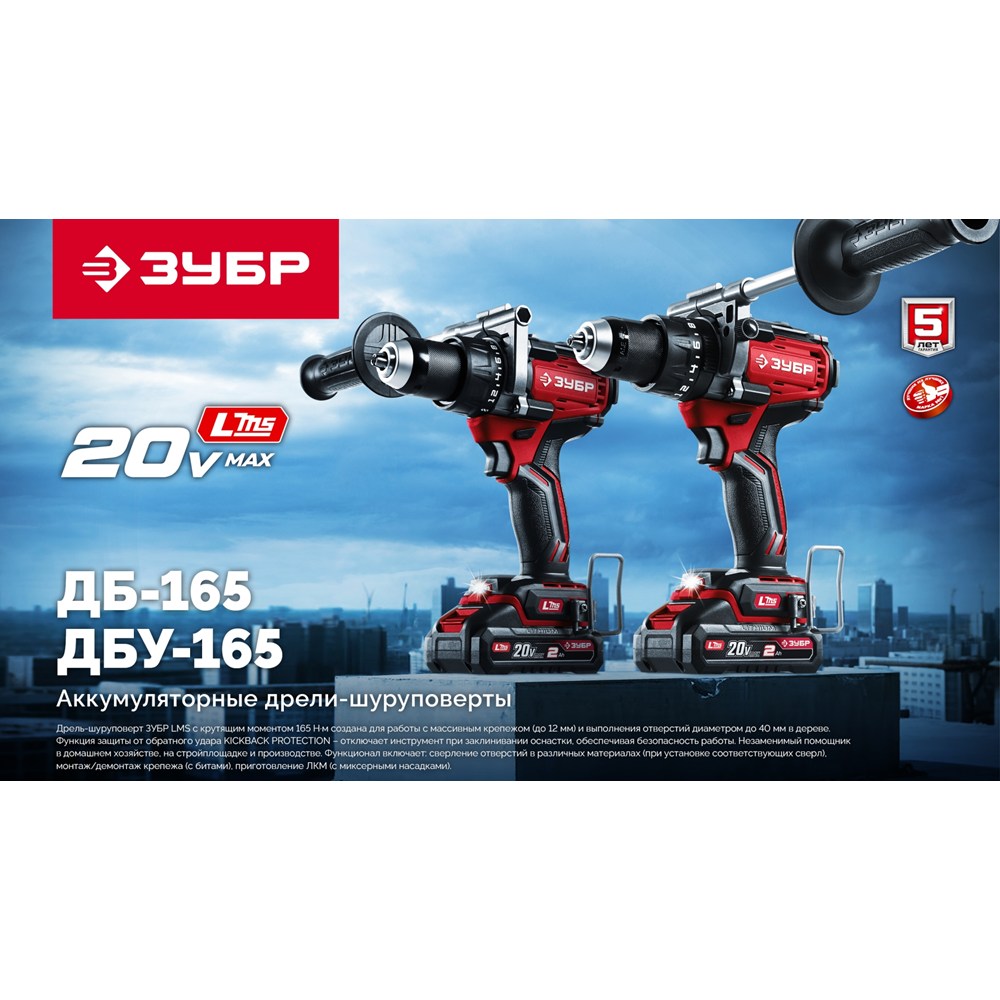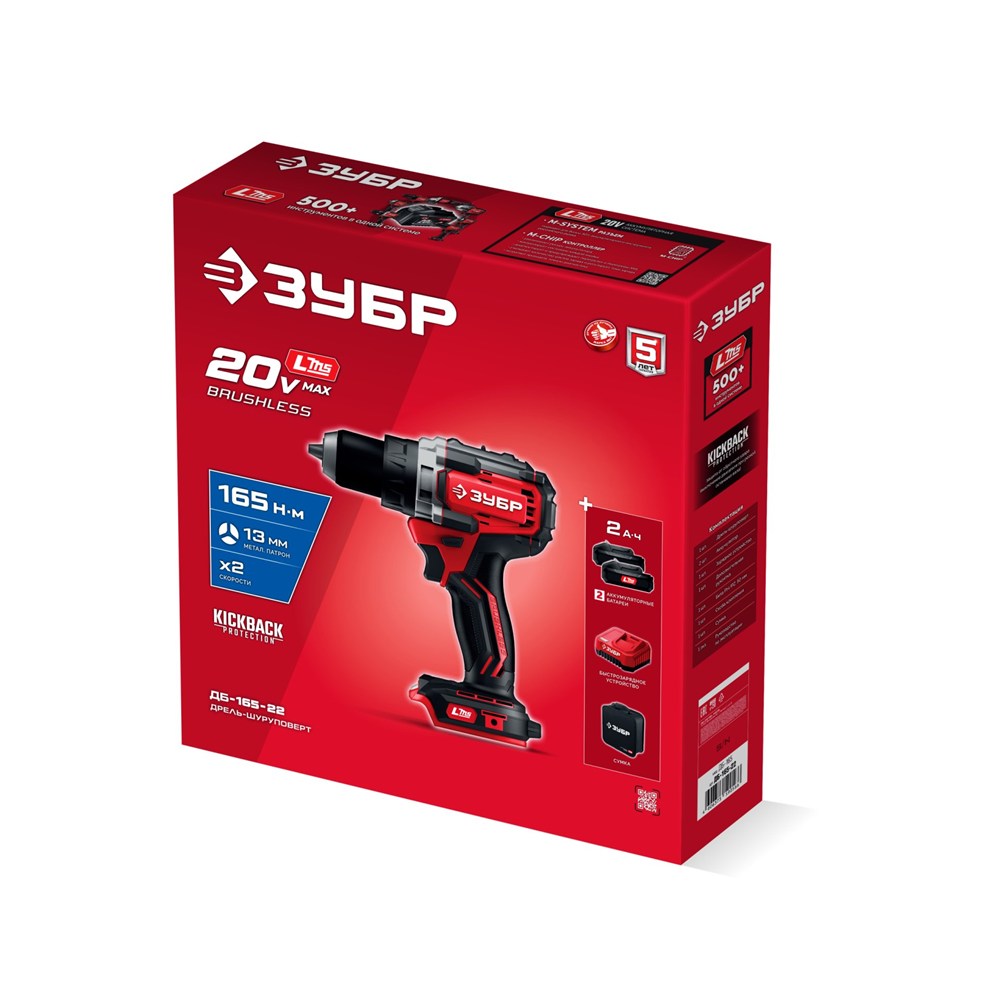 Бесщеточная дрель-шуруповерт ЗУБР системы LMS с максимальным крутящим моментом 165 Нм предназначена для работы с самым крупным крепежом (саморезы до 12 мм диаметром) и сверления отверстий до 40 мм в дереве. Встроенная защита от обратного удара предотвращает повреждение кисти при резкой блокировке вала. Комплектация с двумя аккумуляторами позволяет работать практически без остановки
