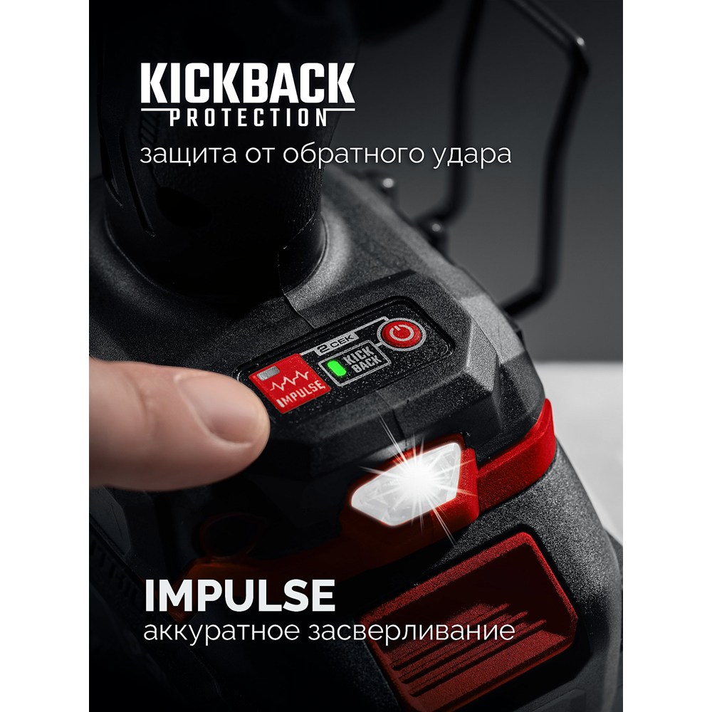 - Встроенная отключаемая защита от обратного удара контролирует рывки инструмента и выключает двигатель, предотвращая травмы оператора