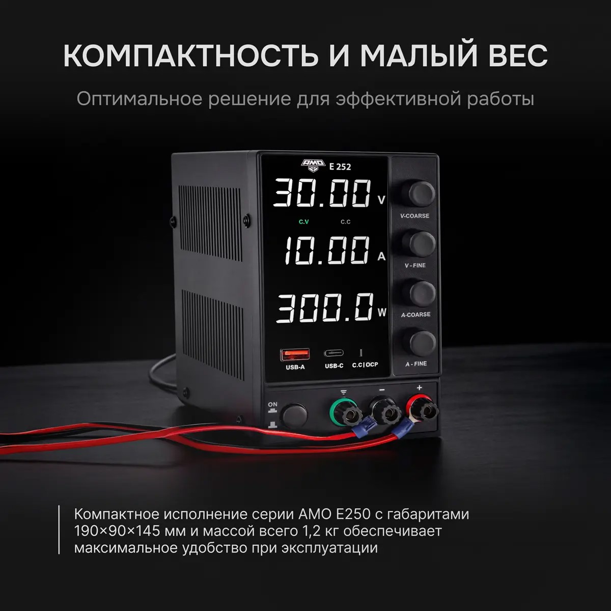 Источник питания AMO E252 — это усовершенствованная версия модели E251 с увеличенным диапазоном выходного тока до 10 А. Он идеально подходит для тестирования мощных усилителей, двигателей постоянного тока, светодиодных матриц, радиостанций и другого оборудования, требующего высокого потребления энергии. Благодаря максимальной выходной мощности 300 Вт, автоматическому режиму стабилизации и надежной защите, модель популярна у профессионалов в сервисных центрах, производстве и НИИ.