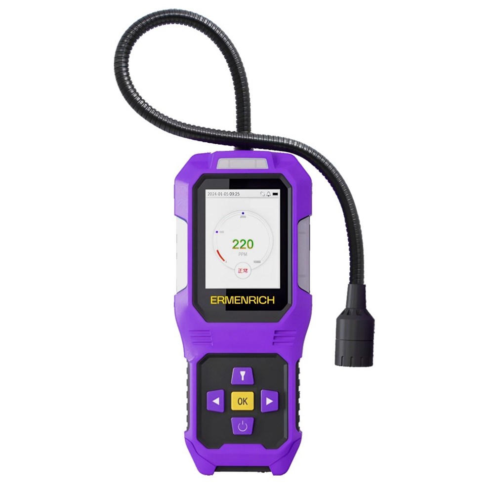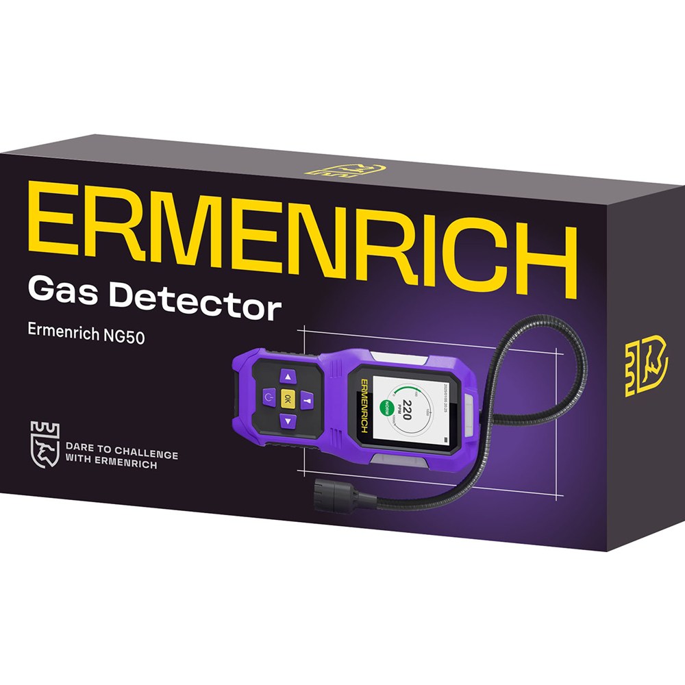 Детектор газа Ermenrich NG50 используется для поиска утечек токсичных и взрывоопасных газов в жилых и производственных помещениях, помогая в устранении опасных для жизни, здоровья и целостности материальных ценностей ситуаций. Прибор оснащен гибким зондом и оперативно обнаруживает следы таких газов, как метан, этан, пропан, бутан, этилен, пропилен, бутен, ацетилен, пропин, бутин и др. Информирование пользователя о превышенных максимальных показателях происходит путем активации трехфакторной сирены – световой, звуковой и вибрационной. По умолчанию пороги срабатывания настроены следующим образом: первый уровень − 500 ppm обнаруженных частиц, второй уровень – 2000 ppm. Эти значения можно изменить самостоятельно через меню настроек. Детектор оснащен встроенным фонариком, позволяющим проводить анализ воздуха в темных труднодоступных местах.