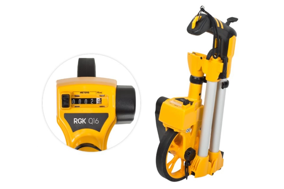 Дорожное колесо RGK Q16 диаметром 160 мм и измеряет расстояния там, где невозможно или нецелесообразно применять мерные ленты или лазерные дальномеры, например, при разметке дорожного полотна или фиксировании параметров при ДТП. Прибор удобен при измерениях при неблагоприятных погодных условиях за счет надежного механического счетчика.