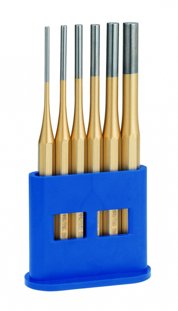 Набор выколоток в пластиковом держателе, восьмигранные, безопасная ударная головка, специальная инструментальная сталь, кованая, закалённая, покрашенная, содержимое: размеры 3, 4, 5, 6, 8, 10 мм. Сделано в Германии.