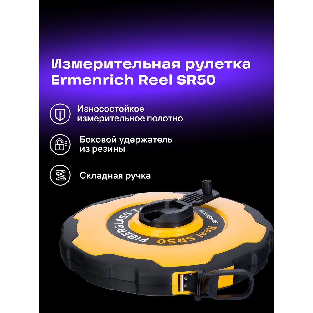 Рулетка Ermenrich Reel SR50 – это универсальный измерительный инструмент, который позволяет проводить замеры длины в пределах 50 метров. Может применяться для контроля распила длинномерных строительных материалов и определения длин габаритных конструкций и изделий. Рулетка будет полезна во время зонирования земельного участка, строительства, ремонта, декорирования. Также найдет свое применение при проведении картографических и топографических работ. Рулетка Ermenrich Reel SR50 отлично подойдет и для бытового использования, и для решения профессиональных задач.
