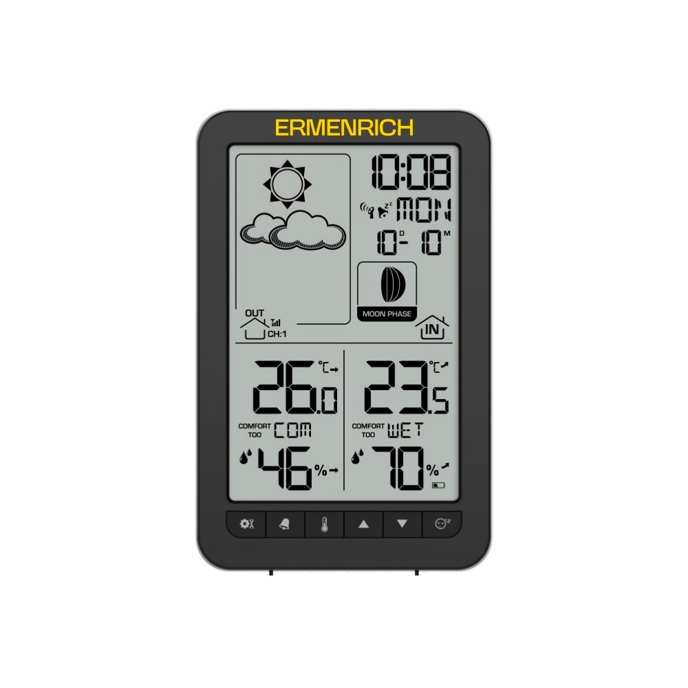 Метеостанция Ermenrich Report WR20 – это домашнее устройство, которое предоставляет всю необходимую для повседневной жизни информацию о текущем состоянии атмосферных показателей. Внутри и снаружи помещения прибор с высокой точностью измеряет температуру и влажность воздуха. В число его дополнительных функций также входят: часы, календарь, отображение фазы Луны, прогноз погоды, оценка уровня комфорта, определение точки росы, отслеживание температурных тенденций для дальнейшего самостоятельного анализа пользователем, предупреждение о возможности появления плесени и многое другое – одно компактное устройство может избавить вас от необходимости постоянного поиска и проверки важной информации в интернете или сервисах на смартфоне.