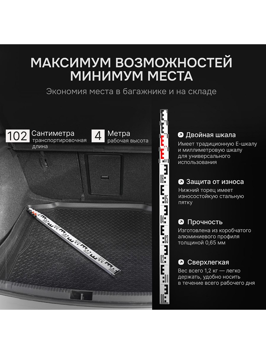 Рейка телескопическая AMO S45, 4 м 5 сложений позволяет определять линейные размеры объектов, а также выполнять вертикальные измерения и фиксировать превышения при совместном использовании с нивелирами в ходе проведения строительных работ и решения геодезических задач. Секции изделия изготовлены из коробчатого профиля из алюминиевого сплава, за счет чего обладают высокой прочностью и износостойкостью, при сравнительно небольшом весе.