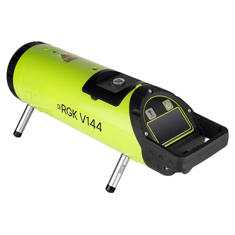 Трубный лазер RGK V144 излучает четкую зеленую лазерную точку, видимую на расстоянии до 600 м при использовании приемника. Доступны режимы автоматического центрирования, сканирования влево/вправо (±4°), а также функция автотрекинга — лазер самостоятельно находит центр приемника и фиксирует луч.