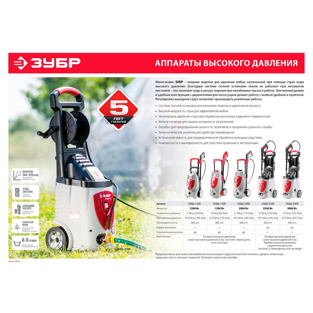 Мойка высокого давления (минимойка) электрич, ЗУБР ЗАВД-2000, макс. 165 Атм, 6 л/мин, 2000 Вт, бесщет двиг-ль, колеса, АВТО-СТОП, 5м шланга, 5м провод